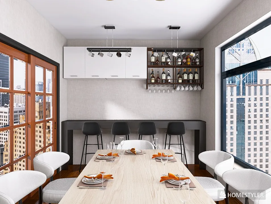 In this dining room, sleek lines embrace solitude, where whispers of jazz mingle with the scent of aged whiskey. The stark beauty of the minimalist bar stands as a sentinel, while forgotten stories linger in the shadows, awaiting a sip of nostalgia.
