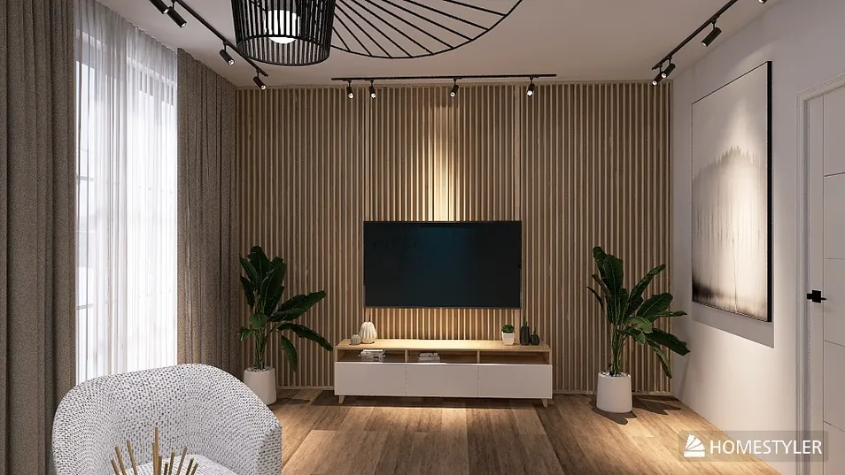Światło delikatnie tańczy po drewnianych podłogach, a minimalistyczne linie mebli zdobią przestrzeń. Zielone liście roślin kontrastują z ciepłym odcieniem ścian, tworząc harmonijną całość, która jakby szeptała: "Piękno tkwi w prostocie, ale kto zauważy nieprzemijalność chwili?"