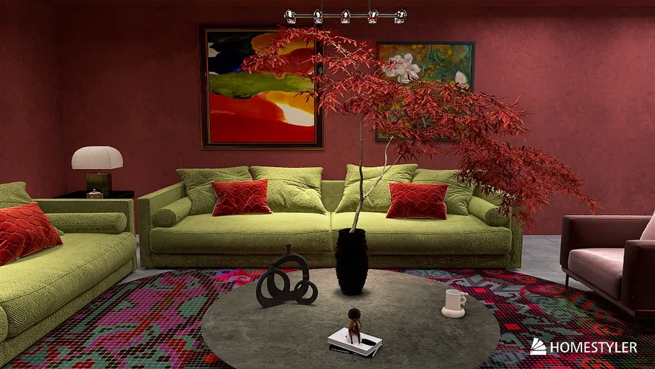 In a bold embrace of red and green, this modern art deco living room pulsates with life. Plush sofas cradle you, while vibrant artwork ignites the walls, creating a sanctuary where warmth meets eclectic elegance, inviting you to linger in its artistic charm.