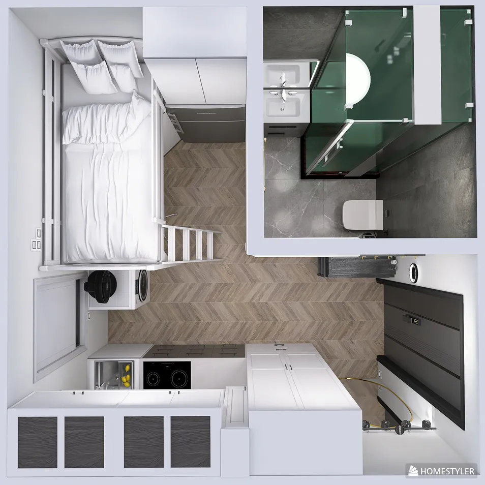 Every element of this space is imbued with practicality. Here, minimalism meets comfort: a compact kitchen, a cozy bedroom, and a stylish bathroom, where even the smallest details become accents. A comfortable minimum for a life without excess. Share your opinion in the comments.