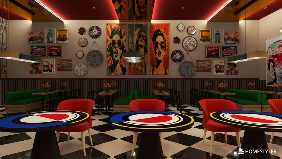 Step into a vibrant American retro restaurant, where bold colors and vintage memorabilia dance on walls adorned with nostalgia. Each table, a canvas of playful design, invites laughter and storytelling amidst the warm glow of hanging lights. A feast for the senses awaits.