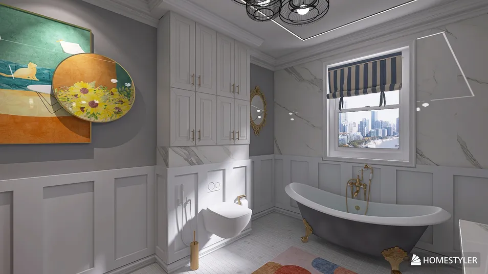 Jasność, złote akcenty i elegancka prostota harmonijnie współistnieją w tej przestrzeni. A to wszystko przełamane żywymi kolorami. Morska zieleń i słoneczne żółcie obrazu ożywiają stonowane detale, tworząc idylliczny azyl w sercu Ameryki. Czerwony fotel idealnie nadaje vintage klimatu.