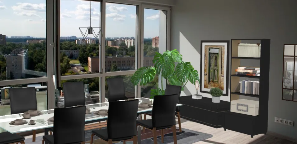 The spacious dining room is opposite the large windows. Large table with glass surface for 8 people. Here you can enjoy fine food and watch the sunset 🌆🥂