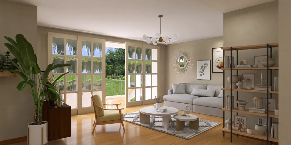 La luz natural inunda la sala, mientras los tonos suaves de la decoración crean un ambiente sereno. Un sofá gris se complementa con una mesa blanca, invitando a momentos de conversación. Las plantas añaden un toque de vida, conectando el interior con el exterior.