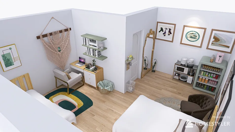 COLLEGEEEEEEE. this is a shared dorm of two roommates i call green and brown, bc obviously. there's also a cat.