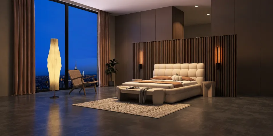 Dans cet espace, la lumière douce de la nuit danse sur les murs, révélant un équilibre parfait entre confort et sophistication. Le mobilier épuré invite à la détente, tandis qu'une vue urbaine captivante rappelle que la beauté se trouve souvent à portée de main.