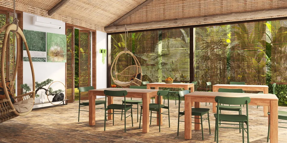 Restaurante ubicado en una zona ecológica decorado con la idea de mantener el ambiente ecológico adentro, con el objetivo de mantener paz.