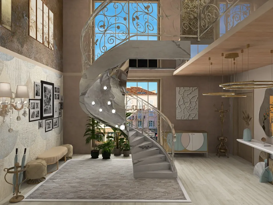 En este salón, donde la luz se enreda en la espiral de mármol, cada curva susurra secretos de opulencia. Los espejos, como ojos vigilantes, reflejan una belleza efímera, mientras los muebles dorados parecen susurrar: 'La verdadera riqueza reside en lo que nunca se posee'.