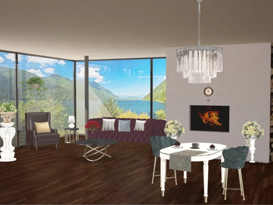 An elegant, ruby colored living and dining area describes this design. Elegant flowers, such as roses, decorate it. This design overlooks a beautiful view, creating a formal, and cozy space.