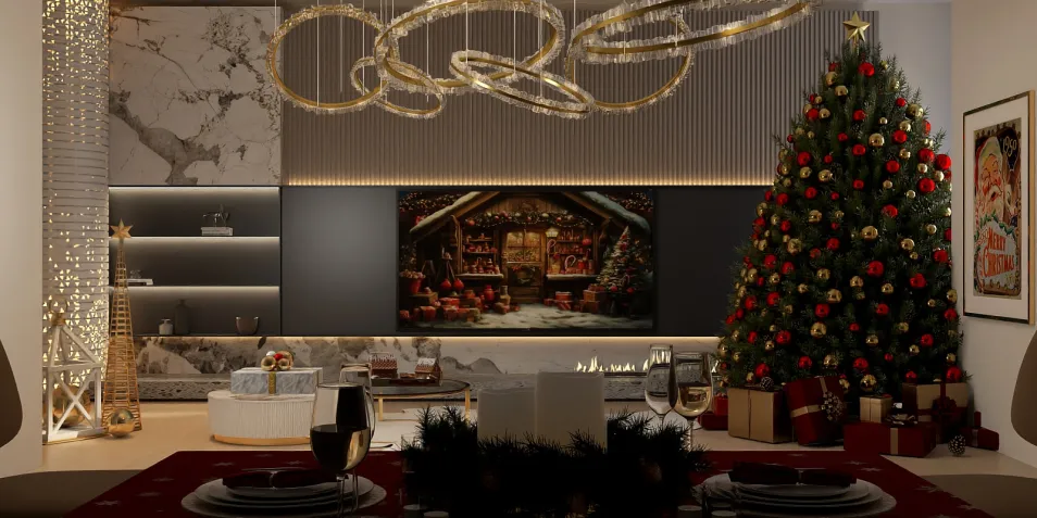 A warm and luxurious holiday-inspired living room featuring a beautifully decorated Christmas tree, soft ambient lighting, and sophisticated modern décor. The combination of gold accents, marble textures, and festive details creates a cozy yet upscale Christmas atmosphere.