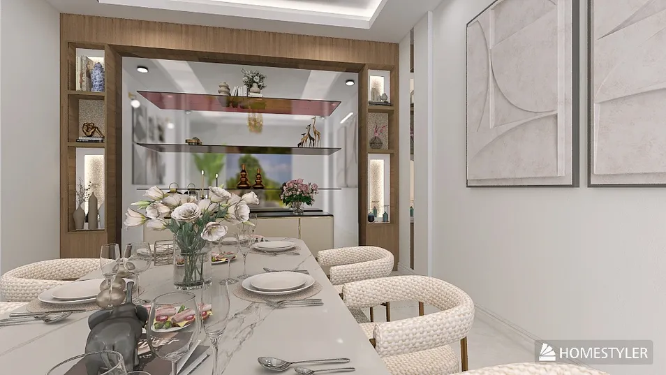 In this refined dining area, light dances off the glossy surfaces, illuminating the delicate floral centerpieces. The warm wood accents cradle a luxurious ambiance, while the minimalist art whispers tales of modernity. Here, every detail breathes sophistication, yet feels hauntingly familiar.