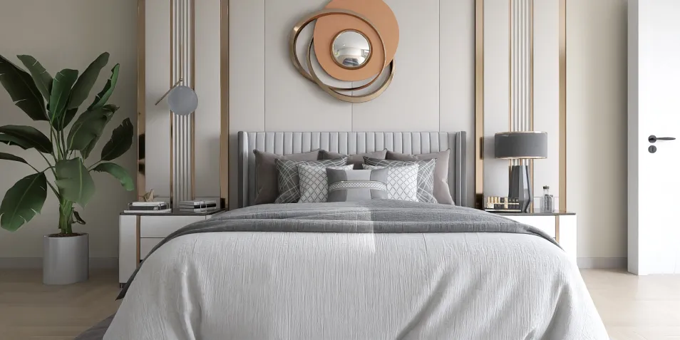 In this serene space, muted tones embrace a plush bed adorned with soft textures. The golden accents glimmer subtly, whispering tales of luxury, while the oversized plant leans in, a silent witness to dreams woven beneath the delicate drapery.