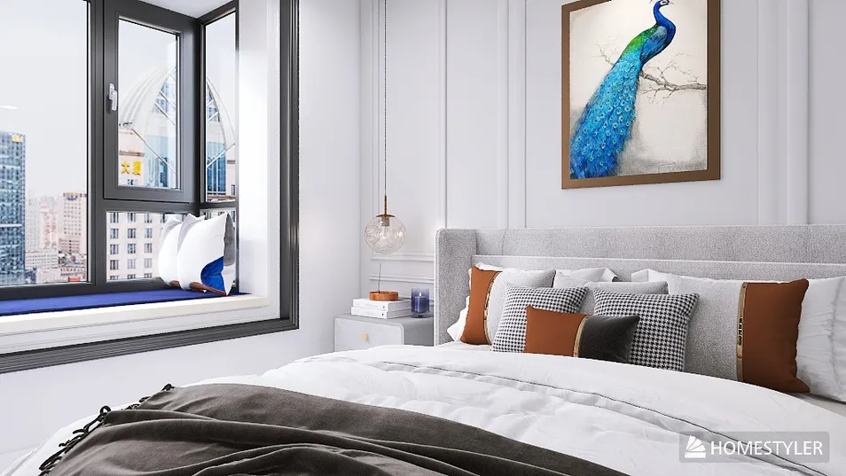 A serene bedroom unfolds, where soft hues meld with the gentle glow of ambient light. Plush textiles embrace a minimalist charm, while a peacock painting adds a splash of regal color, whispering secrets of elegance amidst a tranquil urban landscape.