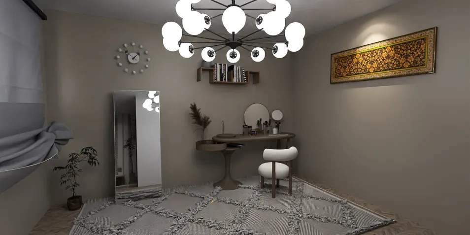 In this serene space, a soft palette embraces minimalist design. The light fixture, a constellation of orbs, casts a warm glow, while the plush rug invites barefoot wanderings. Each detail whispers tranquility, making the room a sanctuary from the chaos beyond.