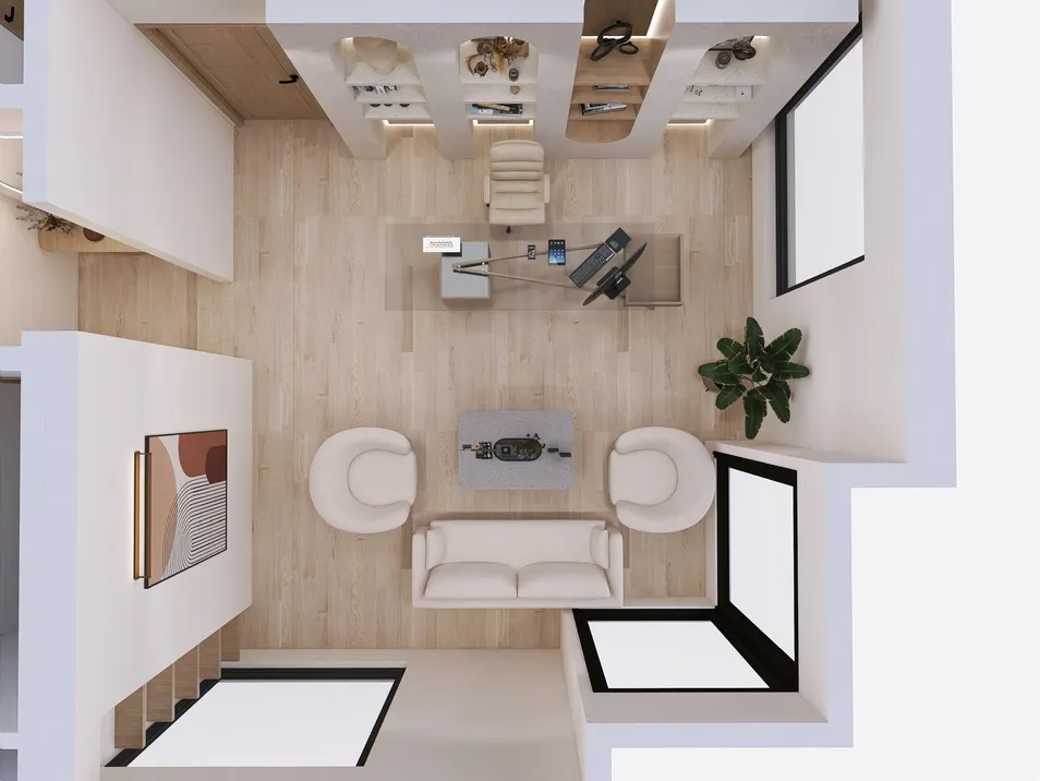 In this office design, sleek lines and natural light converge, creating a serene workspace. Soft hues blend seamlessly with functional decor, while transparent elements invite inspiration. Here, productivity dances with tranquility, reminding us that the art of work can be as beautiful as the beauty of art.