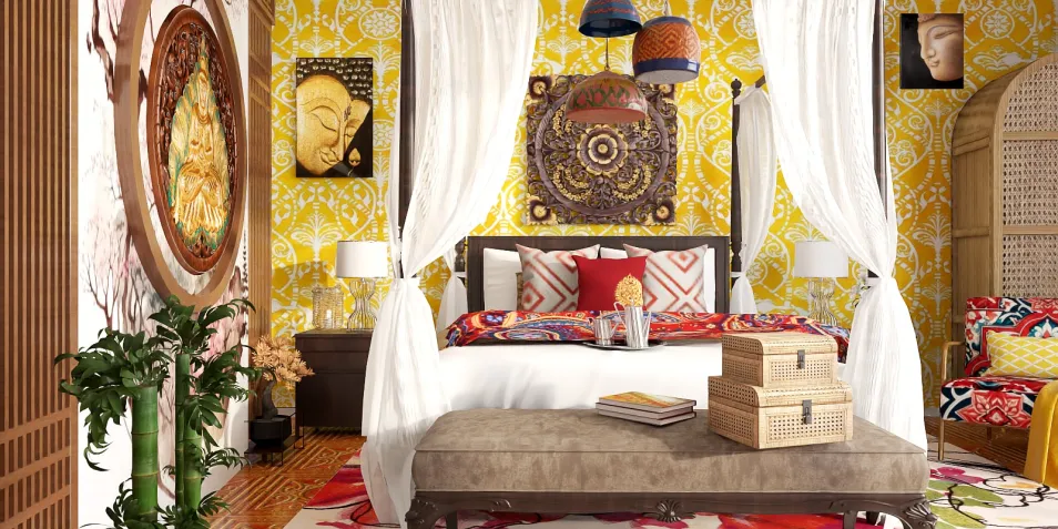 Transform your bedroom into a serene sanctuary with vibrant Thai decor. Rich textiles, intricate patterns, and natural elements create a warm ambiance, inviting relaxation and tranquility. Let the colors and textures transport you to a world of peace and harmony.