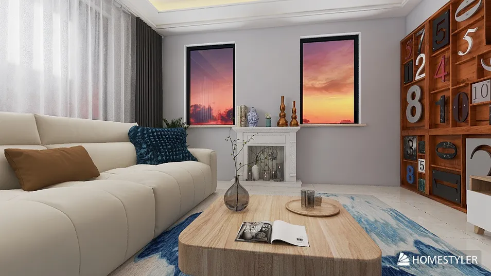 Design Concept:In this tranquil space, the soft curves of the couch invite you to linger. The gentle interplay of light and shadow dances across the walls, while the vibrant hues of nature peek through the windows, whispering stories of quiet moments and serene reflections.