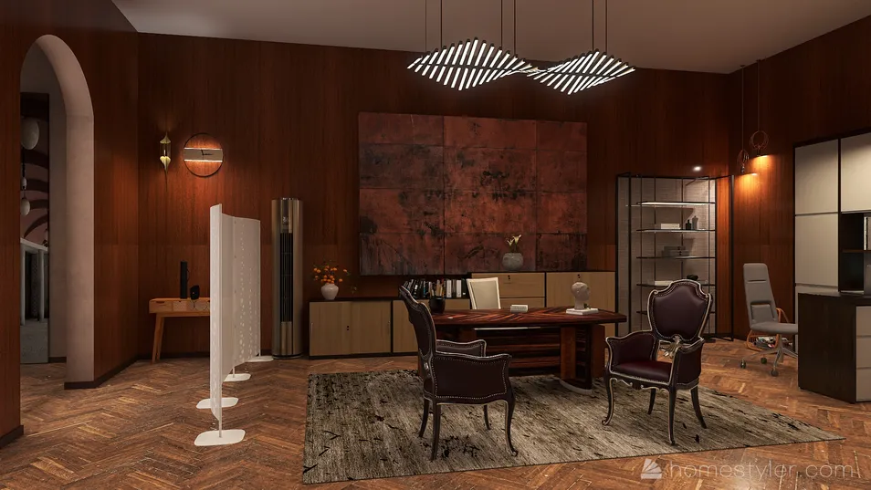 The Modern- Classic wooden style Office Room is simply elegant that is made for the artist's interest. Giving a peaceful work environment for the specific person using this room allows him/her to work efficiently while enjoying the beauty of mixed modern-classic room design.