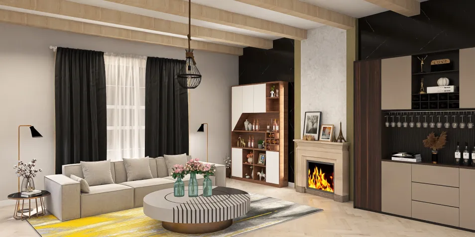 El salón, con su suave luz dorada, evoca calidez. La chimenea chisporrotea mientras las sombras danzan en las paredes. Un sofá gris reposa, rodeado de botellas que susurran cuentos antiguos, mientras las flores marchitas en el centro revelan la ironía de la belleza efímera.