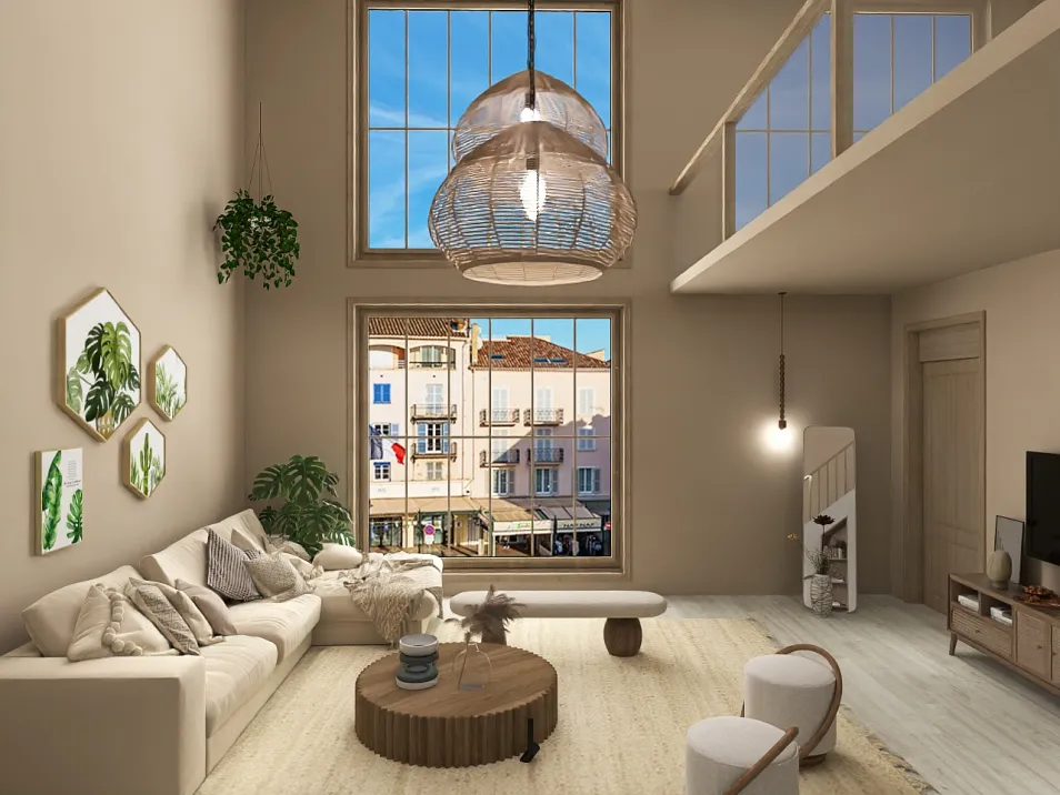 Un salón donde la luz se cuela entre las ventanas, abrazando el minimalismo. La mesa de madera, con su forma irregular, parece un eco de la naturaleza, mientras las plantas añaden un susurro de vida. Aquí, cada rincón invita a la contemplación.