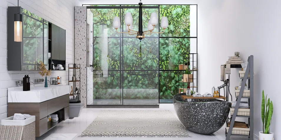 En este baño, un juego de texturas se entrelaza con la naturaleza. La luz se filtra a través del cristal, mientras el mármol y las piedras crean un refugio de calma. Como un susurro de un poema inconcluso, cada elemento invita a la contemplación.