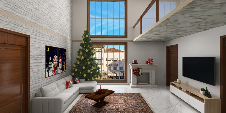 No coração deste lar, um sofá convidativo e uma árvore de Natal resplandecente trazem a magia das festividades. As janelas amplas, como olhos curiosos, permitem que a luz dance pelo espaço, entrelaçando-se com a elegância do tapete persa que sussurra histórias de tempos passados.