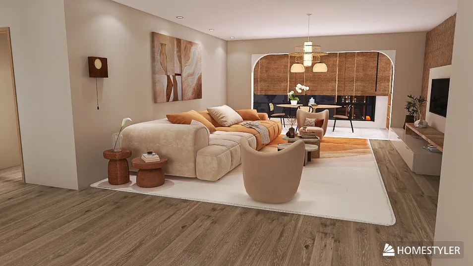 Num ambiente moderno, a madeira aquece o coração. O sofá, suave como um abraço, convida ao descanso. As luzes suaves dançam com os tons terrosos, criando um refúgio acolhedor onde cada elemento parece contar uma história de conforto e harmonia.