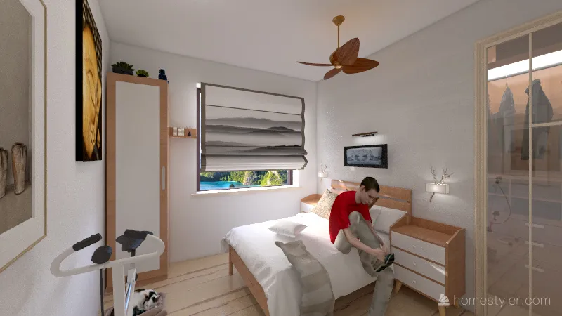 Dormitorio con vestidor, estilo Japindi. Muebles nórdicos en maderas claras y detalles decorativos en estilo Japonés. Espacio reducido, donde se busca la amplitud y zonas despejadas.