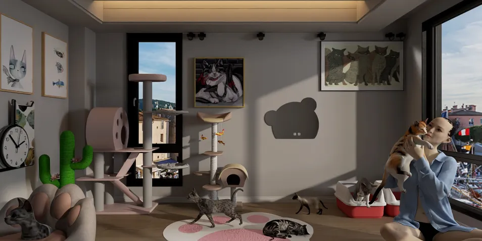 As twilight blankets the room, soft shadows dance across the walls adorned with feline art. A tranquil chaos unfolds—cats stretch lazily, while a gentle hum of purring fills the air, creating a cozy sanctuary where time seems to pause.