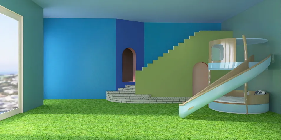 Use of bright and soft colors. Shapes meant to create a fairytale landscape with items that double as functional bedroom furniture.