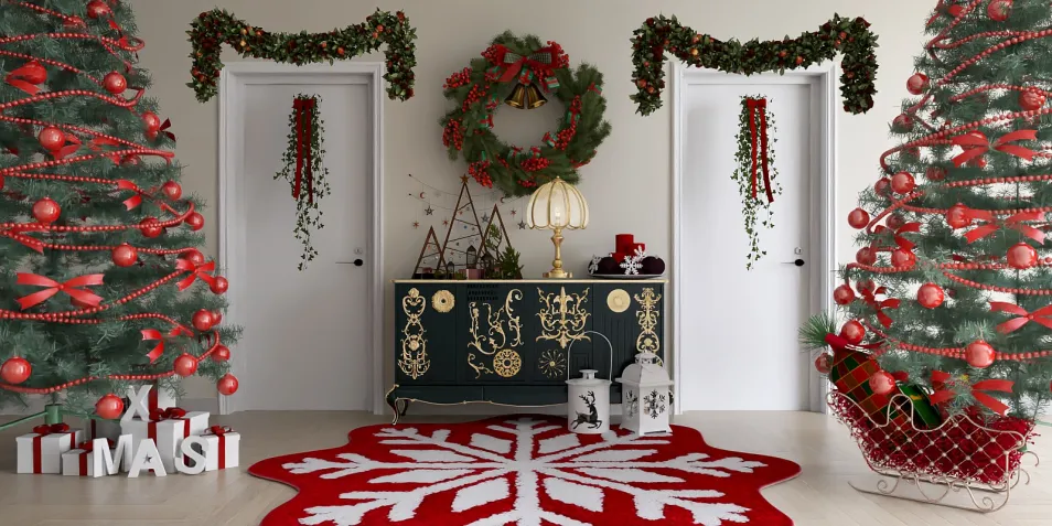 In this holiday haven, evergreen trees draped in crimson ribbons stand sentinel, while a lavishly adorned wreath whispers secrets of the season. The golden accents flicker like distant stars, and beneath it all, a snowflake rug cradles the warmth of togetherness amid the frosty air.
