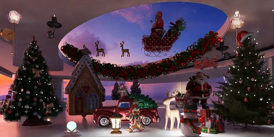 Amidst the twinkling lights and cheerful decor, a cozy truck stands, laden with gifts. Reindeer frolic in the dusk, while Santa's sleigh hovers above, a whimsical promise of holiday magic. This space invites joy, echoing laughter and warmth, a whimsical retreat from the ordinary.