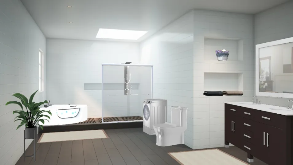 Un ambiente di design e funzionale, con tutto ciò che occorre in un bagno. Colori tenui, pochi eccessi, ma ugualmente di impatto.