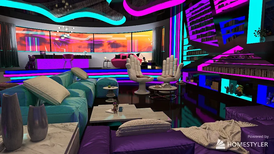 Questa è la mia visione del future design, ho realizzato un ampio soggiorno con area studio. mi piacciono molto le luci e i colori🧡
