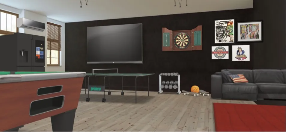 One side of the room... opposite side would feature a bar, more games, another TV with consoles, audio system and PC.