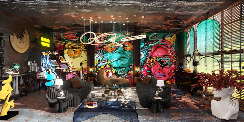 Une garçonnière dans le sous sol d’un riche homme d’affaire pour des moments de détente. La décoration mélange des objets d’art.