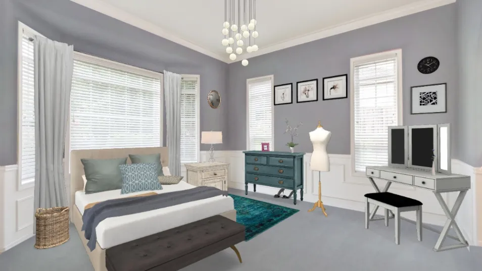 The room has many light tones such as gray, white and light pink. It was inspired by a studio and it has many colors that stand out with others. The room bring comfort and many aesthetic vibes!