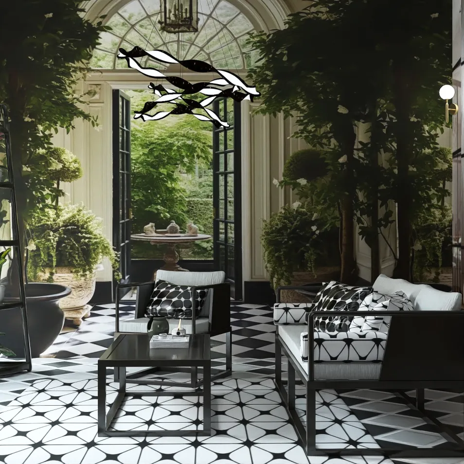 In this serene space, grid shapes dance across the floor, guiding the eye through a symphony of contrasts. Black and white interplay invites contemplation, while lush greenery breathes life into the geometry, creating a tranquil retreat from the chaos outside.Expand