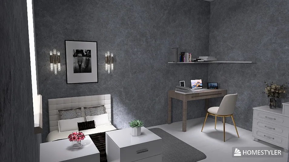 Este espacio fue diseñado pensando en una joven estudiante universitaria, combinando funcionalidad, calma y estilo contemporáneo. La habitación integra una zona de descanso acogedora con una cama de respaldo capitoné y detalles en blanco y negro, además de un área de estudio minimalista con acabados cálidos en madera. Las texturas en tonos gris pizarra en los muros aportan un aire sofisticado y moderno, mientras que la iluminación puntual —tanto en las lámparas murales como en la luz natural— acentúa la atmósfera serena del espacio. El diseño busca transmitir equilibrio entre productividad y descanso, ideal para una chica joven que busca inspiración en su día a día académico.