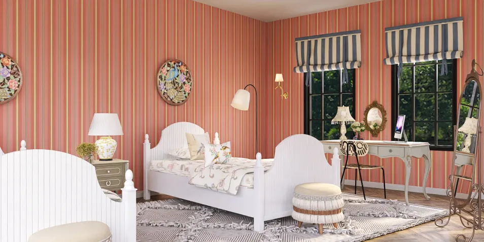 An idea for a guest room or kids room. When my daughters were younger their rooms looked exactly like this in my mind. They had and still have their own ideas. The colour choices chosen from the wallpaper.