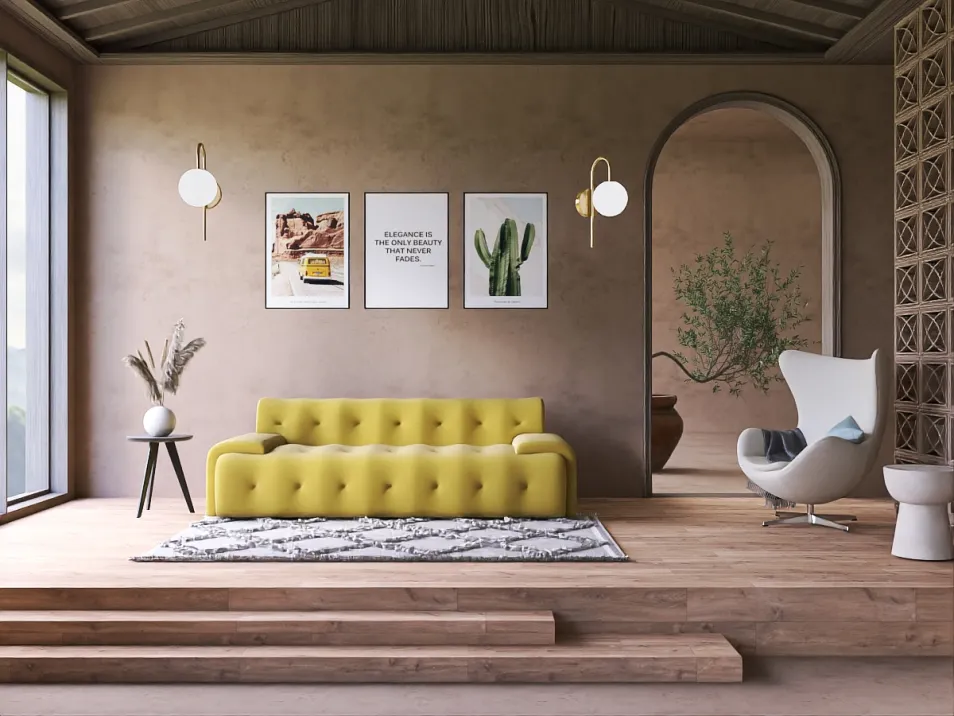 Esta recepción 😍 los colores tierra hacen el espacio más calido, el mueble resalta más fuerza cálida donde complementa el resto de tonalidades. lámparas de pared con un estilo único y sencillo.