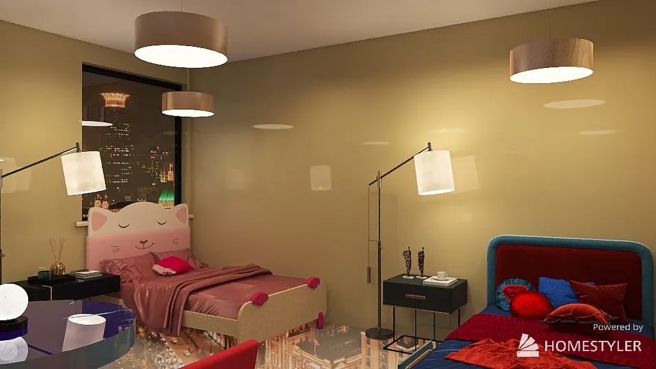 habitacion rosa y azul cama de niña y niño muy bonito con su lamparas y sus cama personalizadas tambien tienen un comedor para hacer sus tareas y jugar juegos de mesa