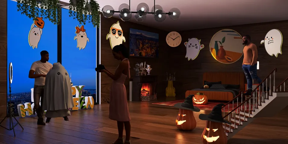 I wanted to design this becuase holloween coming up and by the way I put a ghost and make it a consume for the little boy but I put the ghost up so it can show the boys shoes and the one that’s upstairs is their dad watching them taking a picture and upstairs is the kitchen and the other bedrooms