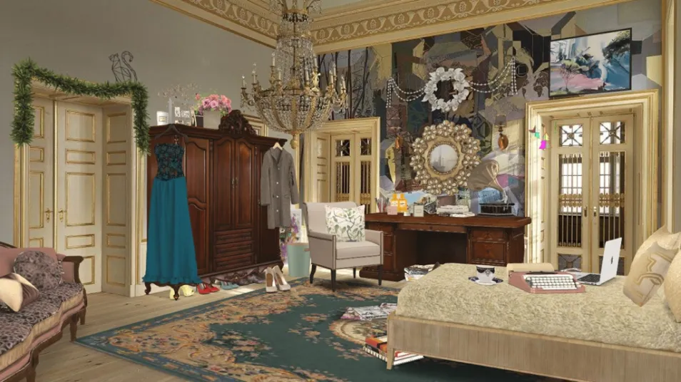 Despite Janet’s father’s disapproval of Christmas decoration in November,Janet still proceeds to go ahead but decides to leave her tree for December.An original 1920’s armoire compliments her desk made with solid oak.Both crafted by her Grandad Frank who died last year from a stroke.Janet loves art hence the lovely paintings dotted across the place.Her mother Jane always nags about the untidy books on the floor,it’s about time Janet invests in a bookcase.