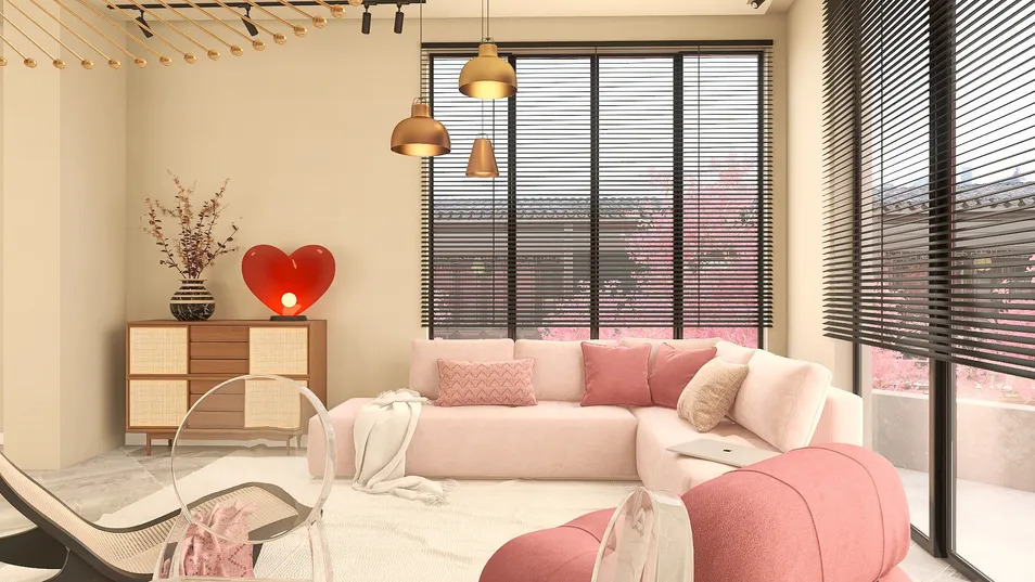 With this template, I split the top of the heart shaped room to create a balcony which is surrounded by beautiful Sakura trees. I find that the Sakura trees really adds to the scenery as it gives this design more of the "Valentines" vibe. There is two seating areas as one is specifically for breakfast which is located in the kitchen area and the other for inviting guests.