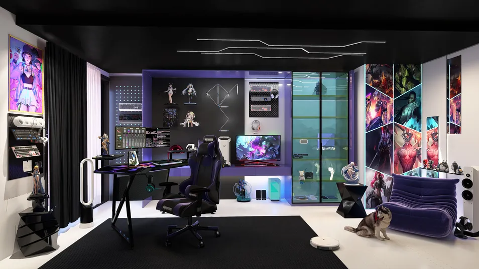 This high-tech gaming room is a dream space for any gamer and anime enthusiast, featuring a futuristic design with sleek black and neon purple tones. The setup is optimized for gaming, streaming, and display, creating an immersive experience. Key Features: Ultimate Gaming Setup: A cutting-edge gaming desk with a curved monitor, mechanical keyboard collection, and high-performance PC ensures top-tier performance. An ergonomic gaming chair provides comfort for long sessions. LED & Futuristic Lighting: Custom LED strips on the ceiling and walls create a cyberpunk-inspired ambiance, enhancing the immersive feel of the space. Anime & Gaming Decor: The room is filled with collectibles, anime figurines, and character artwork, reflecting a deep passion for gaming and Japanese pop culture. Display & Storage: A glass display case showcases prized gaming gear and figurines, while wall-mounted pegboards keep peripherals organized. Entertainment & Comfort Zone: A plush purple lounge chair and a high-quality speaker system make the space perfect for both gaming and relaxation. A husky companion adds warmth to the high-tech environment. This modern and stylish gaming sanctuary is a perfect fusion of technology, aesthetics, and comfort, designed for an immersive gaming and streaming experience.