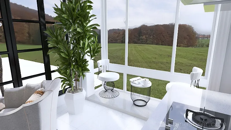 This design is for a self-build using two 20ft containers joined together in an L shape. This creates a private area that the living and bedroom share. Via large windows. There is an outside staircase that leads to the roof of the containers, that can be used for solar panels to power the house electricity.
