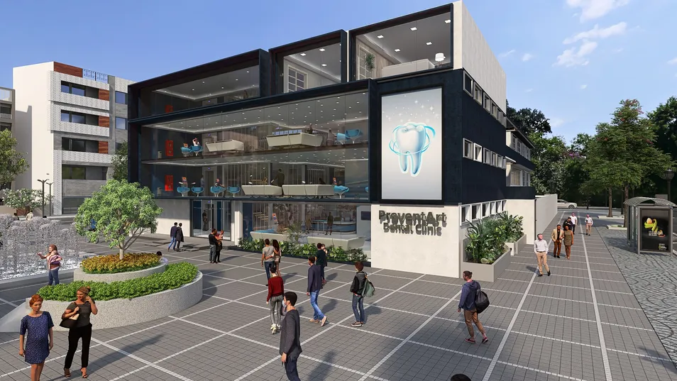 Una Clínica Dental desarrollada en 4 plantas, con consultorios, salas de espera, oficinas, patio y estacionamiento