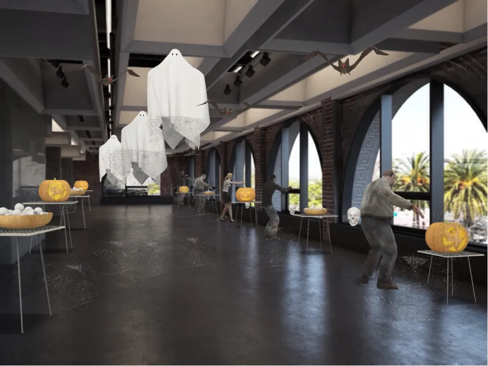 This is my spooky Halloween haunted room and it has skull heads, zombies, bats, pumpkins, bowl of eye balls, and ghosts.