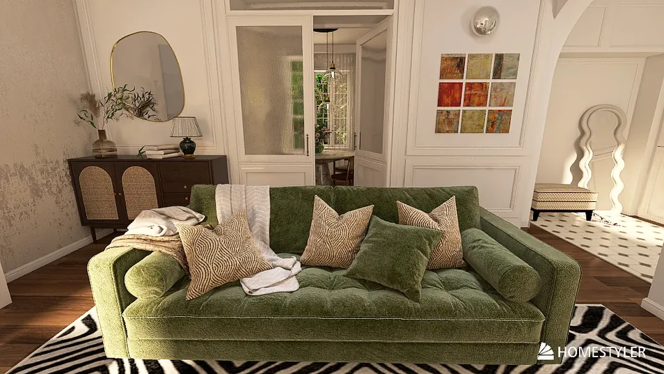 My imaginary home is a historic structure, surrounded by greenery. At the entrance, there's a custom-made piece of furniture that doubles as a coat rack and shoe rack. The floor features original historic tiles. The living room is accessed through an arched entrance. The bright living room features a stunning curved window. The walls are decorated with boiserie and textured paint. The TV wall is also framed with boiserie. You can see the large white bookcase, also custom-made. Behind the sofa, a beautiful glass door leads to the dining area and the rest of the house. The furnishings have been designed to ensure maximum comfort and aesthetics. I hope you like it!